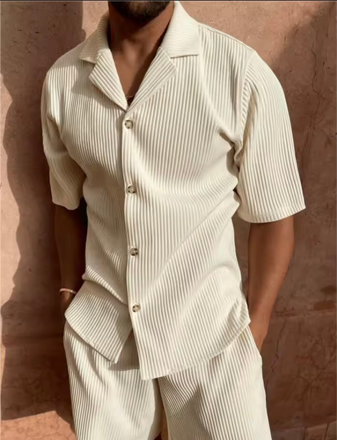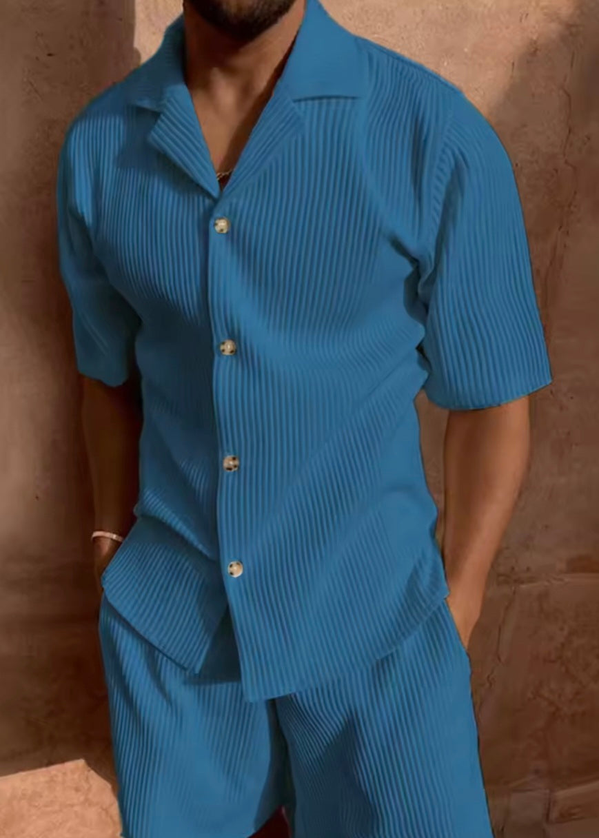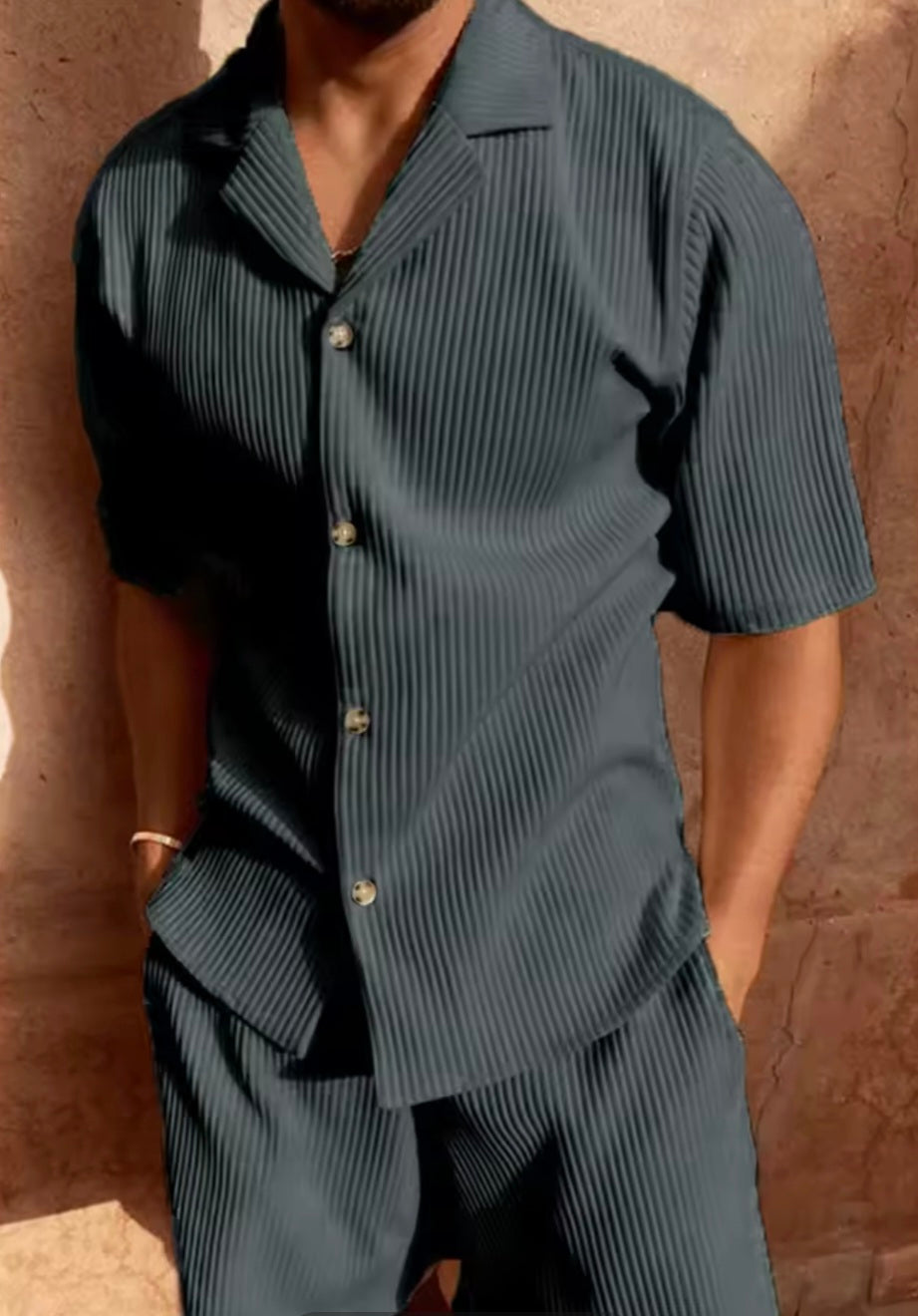 Luce con estilo sin renunciar a la comodidad con nuestro conjunto corto de pana para hombre. Diseñado para quienes aprecian la moda casual con un toque sofisticado, este set incluye camisa de manga corta y pantalones cortos a juego, confeccionados en pana suave y fresca, perfecta para la temporada.